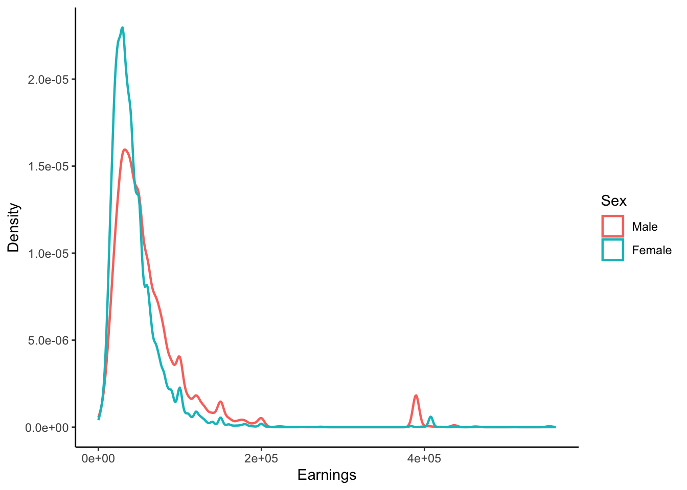 The variation in the data arises from a mix of observed (e.g. age) and unobserved factors (e.g. ability). We seek to satisfactorily explain the heterogeneity that arises in economic datasets. A simple first step is to stratify the data by some aggregate characteristics of the observational unit. In our example, we could plot the earnings density separately for men and women, as shown in Figure 2.