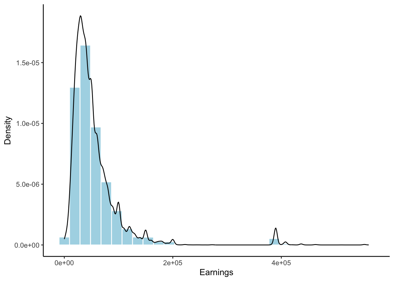 # Read the CPS datasetcps <-read_excel(here("hasen-econometrics-datasets", "cps09mar", "cps09mar.xlsx"), col_names =TRUE)# Plot earningsggplot(cps, aes(x =seq_along(earnings), y = earnings)) +geom_point(alpha =0.3) +labs(x ="Observational Unit",y ="Earnings" ) +theme_classic()# Plot the density of earningsggplot(cps, aes(x = earnings)) +geom_histogram(aes(y =after_stat(density)),bins =30,fill ="lightblue",color ="white") +geom_density(color ="black", linewidth =0.5) +labs(x ="Earnings", y ="Density") +theme_classic()