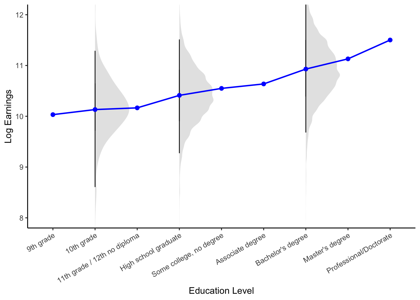 # Map numeric education codes to readable ordered labels (once)edu_code_levels <-c(9, 10, 11, 12, 13, 14, 16, 18, 20)edu_code_labels <-c("9th grade","10th grade","11th grade / 12th no diploma","High school graduate","Some college, no degree","Associate degree","Bachelor's degree","Master's degree","Professional/Doctorate")cps <- cps %>%mutate(education_cat =factor( education,levels = edu_code_levels,labels = edu_code_labels,ordered =TRUE ) )# Lock the desired display order explicitly (prevents reordering later)edu_levels <- edu_code_labels# Keep positive earnings and build log earningscps_pos <- cps %>%filter(earnings >0, !is.na(education_cat)) %>%mutate(log_earnings =log(earnings),education_cat =factor(education_cat, levels = edu_levels, ordered =TRUE))# CEF: mean log earnings by education category (all categories)cef_data <- cps_pos %>%group_by(education_cat) %>%summarise(mean_log_earnings =mean(log_earnings), .groups ="drop") %>%mutate(education_cat =factor(education_cat, levels = edu_levels, ordered =TRUE))# Choose categories where you want the half-violinsselected_levels <-c("10th grade", "High school graduate", "Bachelor's degree")violin_data <- cps_pos %>%filter(education_cat %in% selected_levels) %>%mutate(education_cat =factor(education_cat, levels = edu_levels, ordered =TRUE))# ---- Plot: keep your original look, overlay left half-violins on selected levels ----ggplot() + ggdist::stat_halfeye(data = violin_data,aes(x = education_cat, y = log_earnings),side ="right",normalize ="groups",width =0.9,slab_alpha =0.35,slab_fill ="grey70",slab_color =NA,interval_size =0,point_size =0 ) +geom_line(data = cef_data,aes(x = education_cat, y = mean_log_earnings, group =1),color ="blue", linewidth =0.8 ) +geom_point(data = cef_data,aes(x = education_cat, y = mean_log_earnings),color ="blue", size =2 ) +scale_x_discrete(limits = edu_levels, drop =FALSE) +scale_y_continuous() +coord_cartesian(ylim =c(8, 12)) +labs(x ="Education Level", y ="Log Earnings") +theme_classic() +theme(axis.text.x =element_text(angle =30, hjust =1))