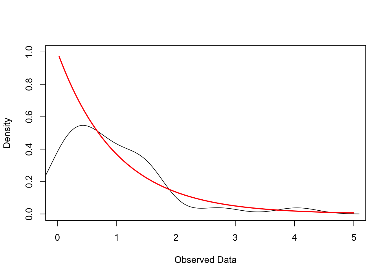 # Simulate IID sample of 30 obs from exp(1)set.seed(123)n <-30x <-rexp(n, rate =1)# Empirical Density dens <-density(x)# True Exponential Densityxs <-seq(0, max(x), length.out =200)ys <-dexp(xs, rate =1)# Plotplot(dens, main ="", xlab ="Observed Data", ylab ="Density", xlim =c(0, 5), ylim =c(0, max(c(dens$y, ys))))curve(dexp(x, rate =1), from =min(x), add =TRUE, col ="red", lwd =2)